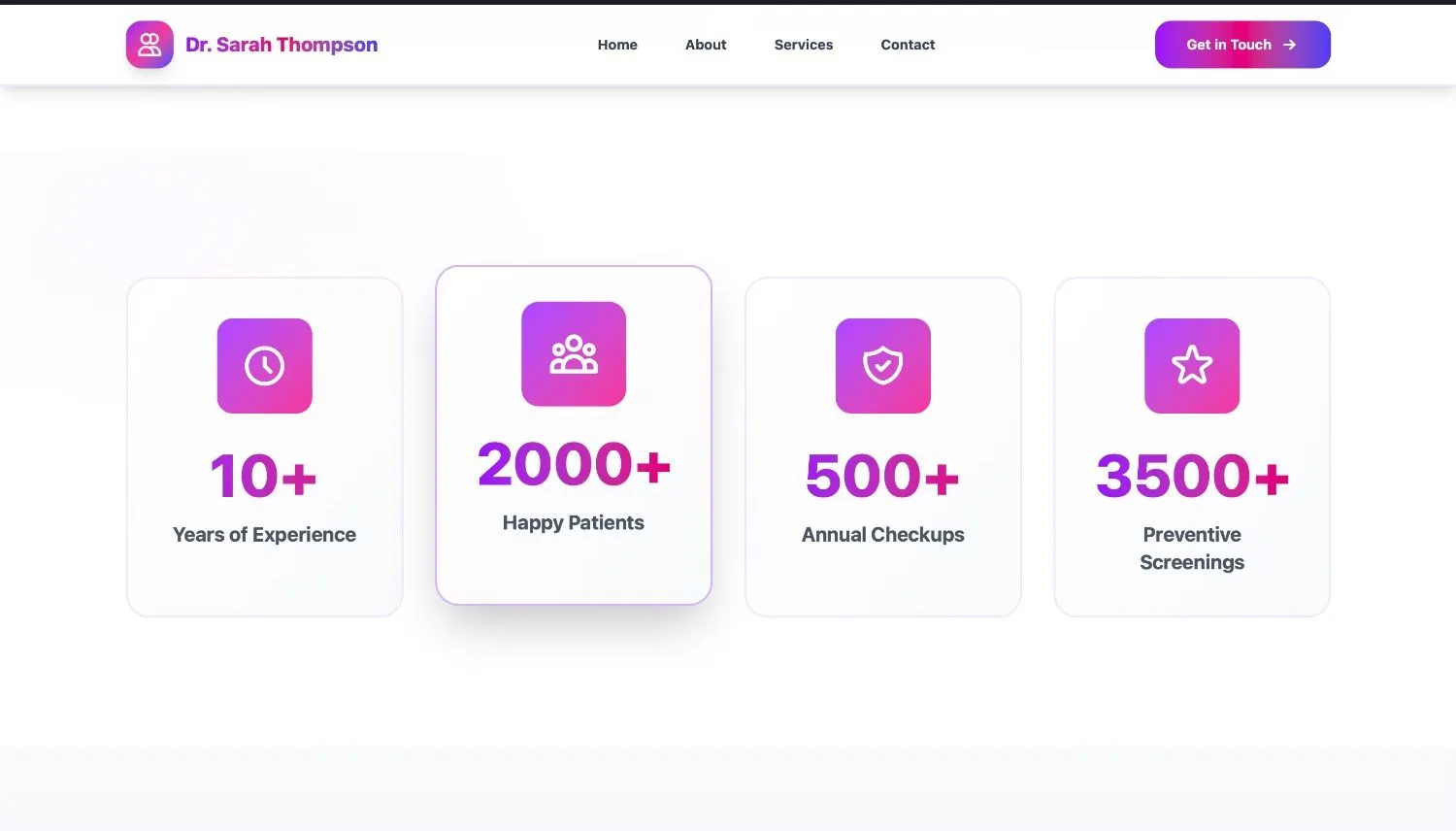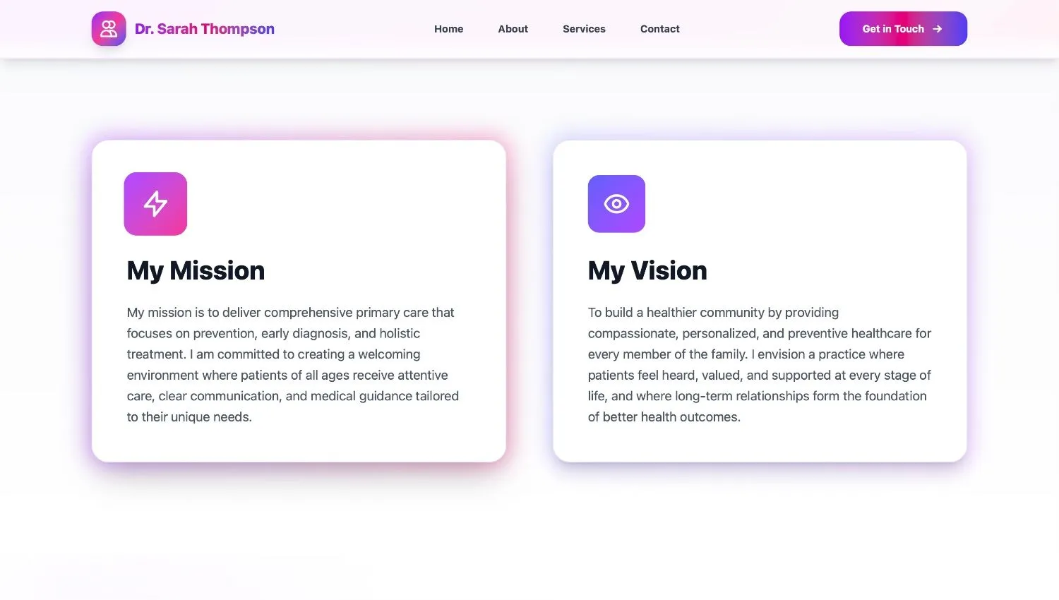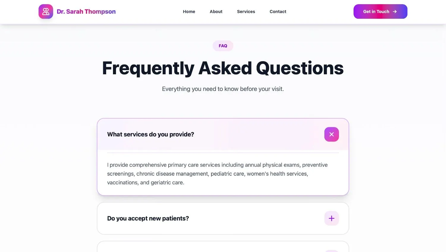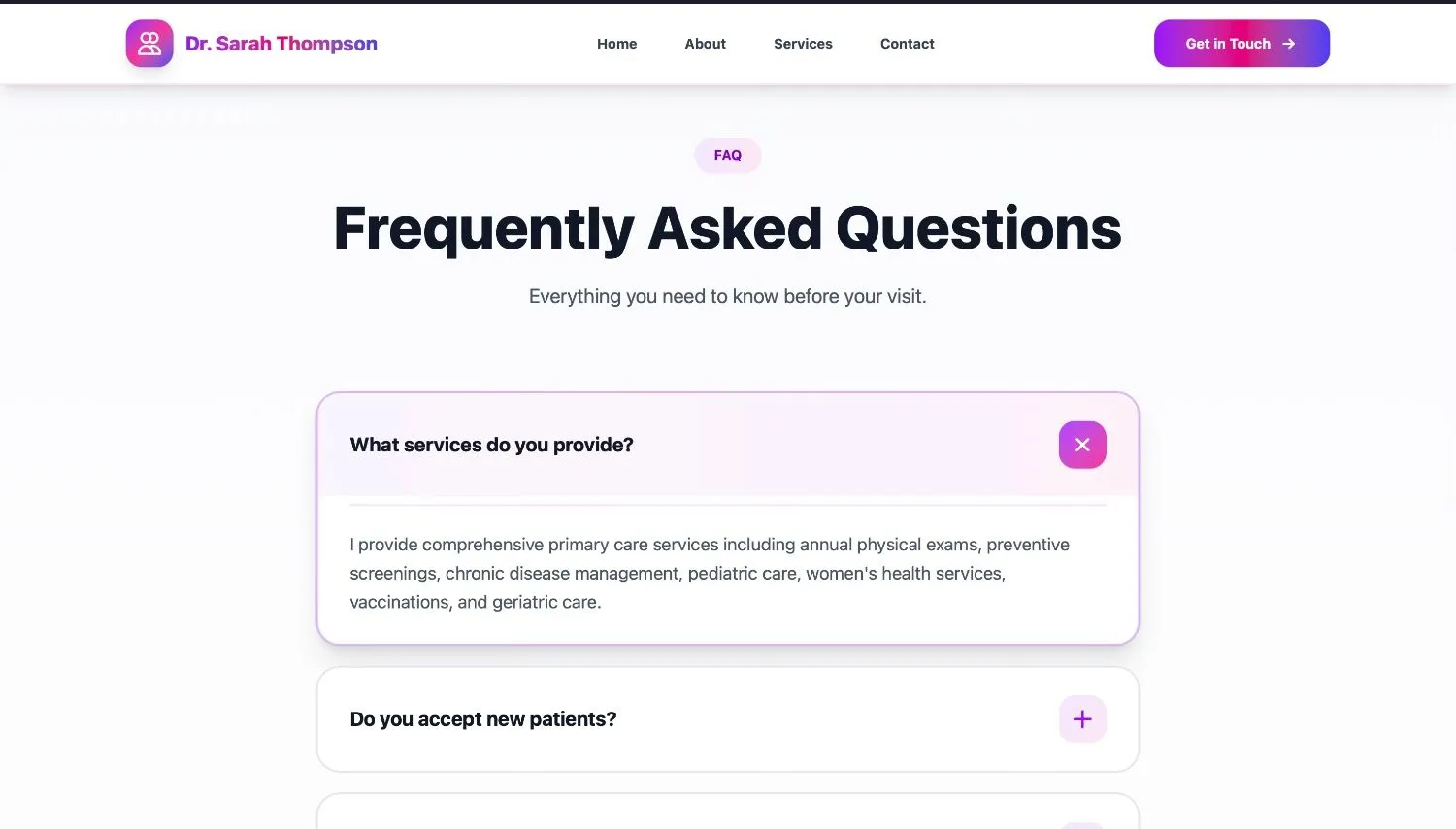 A modern, professional website template for family practice physicians and primary care clinics. Featuring key sections like About, Services, Appointments, Testimonials, FAQs, and Contact, it combines trust and clarity to create a welcoming online presence and attract new patients.