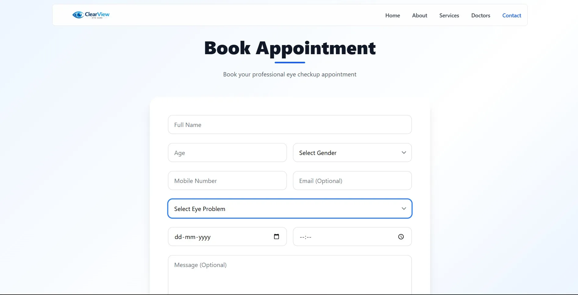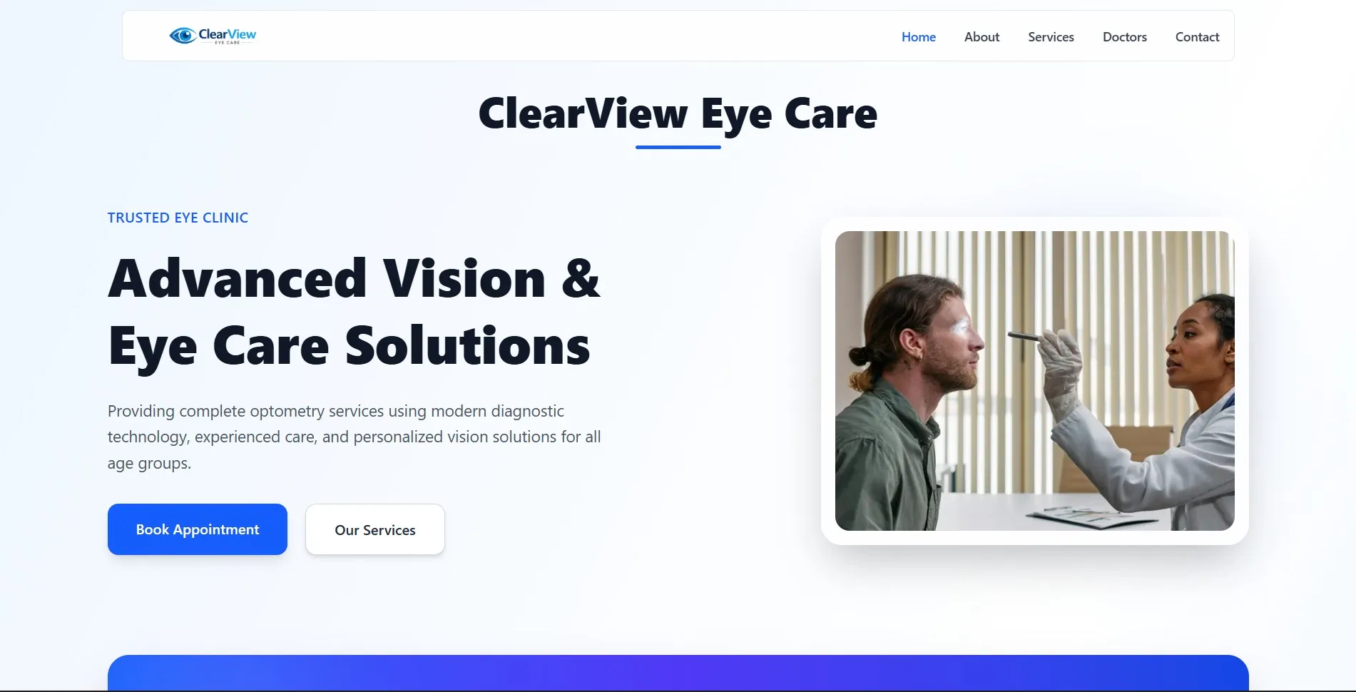 ClearView EyeCare is a modern Optometrist Clinic website designed to provide complete eye care information, vision services, and easy appointment booking with a clean and professional user experience.