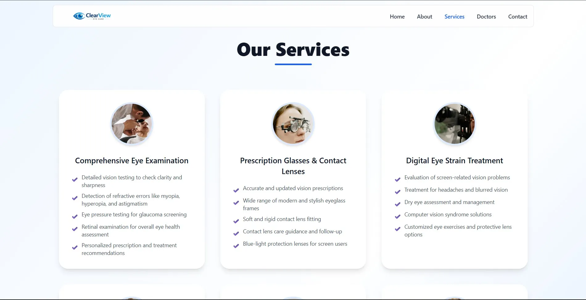 From routine eye check-ups and vision testing to prescription glasses consultation and advanced eye care services, ClearView EyeCare ensures that patients can easily explore services and book appointments online. The website features well-structured pages, smooth navigation, and fully functional forms for a better user experience.