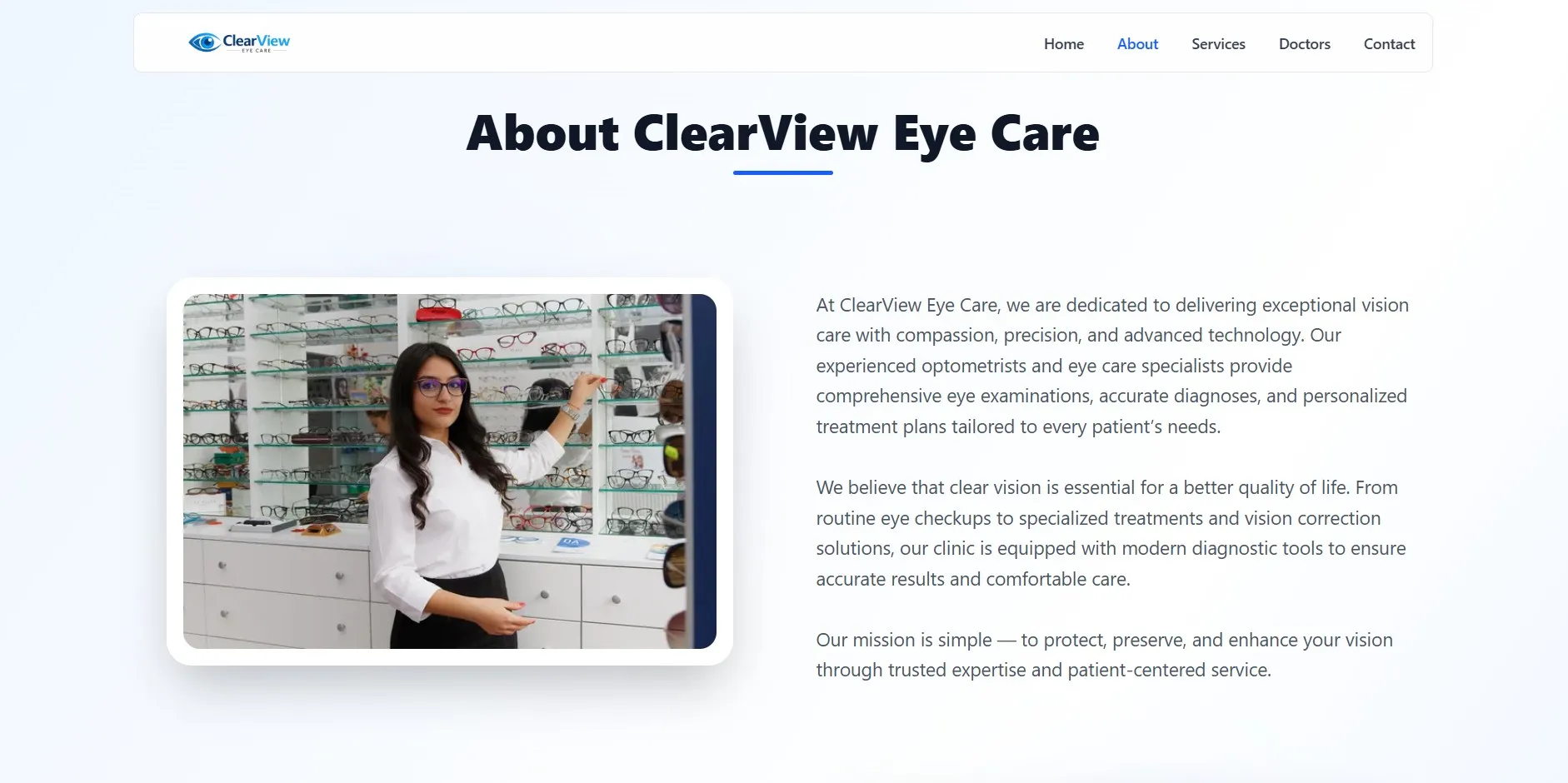 With a clean design, responsive layout, and professional presentation, ClearView EyeCare builds trust and enhances the clinic’s online presence, making eye care accessible and convenient for everyone.